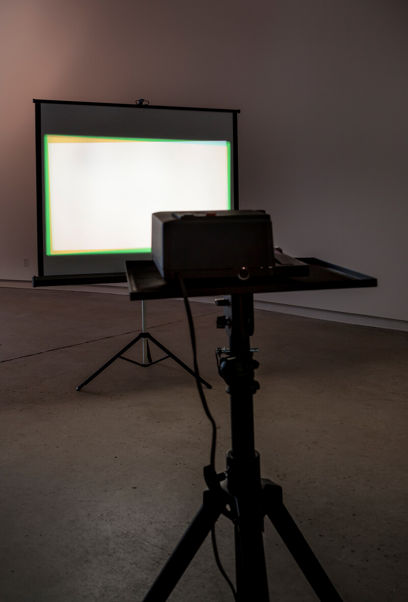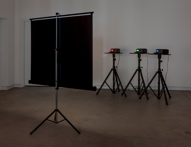 Aryen Hoekstra’s Out of Focus (RGB) ironically both refutes and confirms the title of the exhibition (Red, Green, Blue ≠ White). Three slide projectors devoid of slides beam light through a coloured filter whilst continuously auto-focusing. The red, green, and blue beams are positioned to converge into a rectangular field—a white or ‘non-image’ is thus created that represents the absence of colour. Upon further reflection however, one notices that the three beams result in a field of impure white; a not quite white. When a viewer intercepts the projection throw, incidental colours are created because in instances when two primary colour sources overlap coloured silhouettes of yellow, red, green, pink, etc. appear which mark the body of the interceptor. In this gesture, the body acts similar to a prism—when the white light meets the body, a multitude of coloured refractions result.