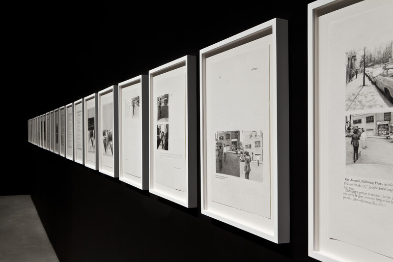 In the Following Following Piece (Montreal, July 8, 2008 to June 2, 2010), Thérèse Mastroiacovo has extensively researched instances in which images of Vito Acconci's Following Piece (1969) have appeared in print. She then draws these appearances in print, rendering the iconic images, following the layout, keeping text indicators such as page numbers, titles and captions but excising any text extraneous to Acconci’s own. The drawing hand follows the performer's footsteps. The translation is meticulous, yet still idiosyncratic and replete with anomalies. This artistic take on bibliographic research opens a discussion on the legacy of conceptual art broadly stated. The current field of conceptual art practices is densely populated with an ever-widening scope of hyper-referential tactics which deny origin, abrogate expression and swallows its source materials whole. In Following Following Piece, the transpositions from furtive performance to photographic document to historicizing print and finally to framed fac-not-so-simile durational drawing for exhibition are all at play as they each inflect their unique alterations on the mimetic process. The drawing series obviously required the deft hand of a human scanner to activate. But more crucially, it required a willingness to pass through the referenced work. The digestive process entailed is considerable when the dissemination of the reference has produced an ample bibliography—the Following Piece has propagated in publications on performance art, as well as other disciplines, including recently, surveillance. The theoretical and the technical method deployed by Mastroiacovo to produce the series of 53 drawings: a muted hermeneutic blended with a mimetic mechanic. Current conceptual practices often favour such nuanced and fine tuned projects. Projects following tactics that don't push, but nudge. They are panegyric acts also intended to prick lineage, to deflate aura, and debunk artifice. One step forward and backward at the same time. In its gallery presentation, Following Following Piece will formally resemble a straight line, but it will not be a clean line for it will be charged with static. The kind of static that is parasitical and noisy—it's an endlessly recombinant line, a followed line to follow. The line drawn is a noisy affair. Saturated and suffused, it goes as far against the grain of honed perfection as to include unfinished followings, thwarted drawings. They are left hanging along with the rest in order to further distort the replay. In time, the line circles back onto itself. Following Following Piece is a work tuned in re-, the prefix of return, rewind, repetition.