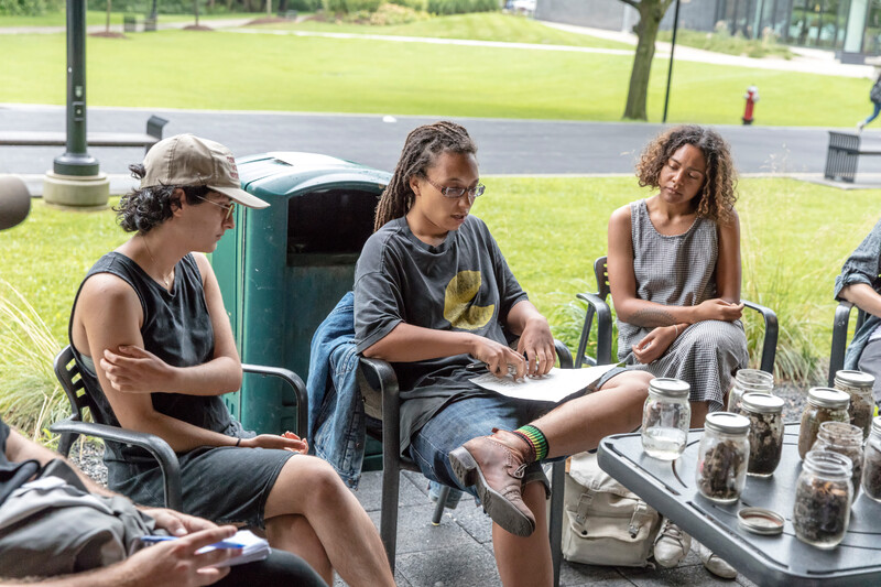 In Golboo Amani’s Garden Skool, workshops with local earthworkers operate as sites for community skill-sharing and knowledge exchange, repurposing the University’s landscape as a space rich with pedagogical potential outside the traditional classroom structure. For the first component of Garden Skool, Melisse Watson presents the workshop “Soil On Which We Stand,” identifying soil, plants, trees, and flowers as relatives, and elders, that inform the deepening of our relationships to land. Abedar Kamgari’s site-specific performance, as part of her ongoing project Finding words for the feeling, navigates the unfamiliar spaces of the campus by tracing the intimacies of human presence woven into the University’s public but often inaccessible sites. Chloé Roubert and Gemma Savio’s intervention into the campus lawn, It Takes Work to Get the Natural Look, explores the tensions between modernist architecture and green spaces by foregrounding questions of labour, landscaping, and the constructed definitions of what is natural and what is cultivated.