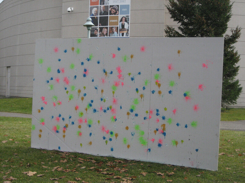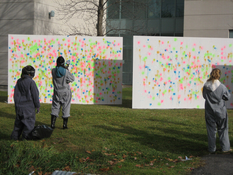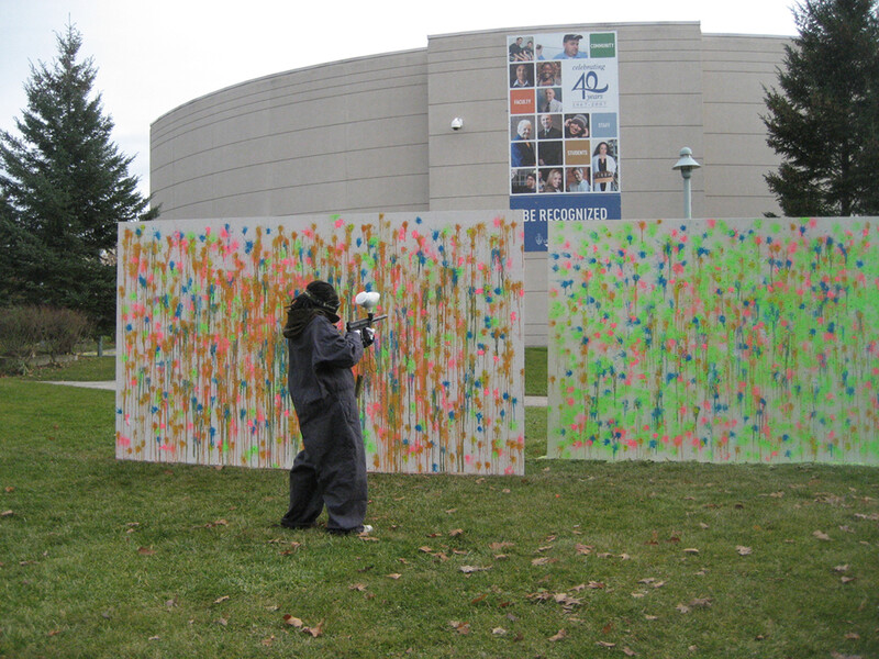 Forty years after the global 1968 uprisings, German artist Tilo Schulz has arranged a performance and exhibition that involves student action, 1950s–style abstract painting, and local Cold War politics. On the University of Toronto Mississauga campus, a large-scale event involving students stages the construction of 'revolutionary' abstract paintings through the use of paint-ball guns. Meanwhile, in the gallery, an exhibition revolves around this event and the subsequent images in the context of relevant histories, as well as around the legend of Mississauga resident Igor Gouzenko, Canada's first true Soviet spy who only ever appeared in public wearing a hood.