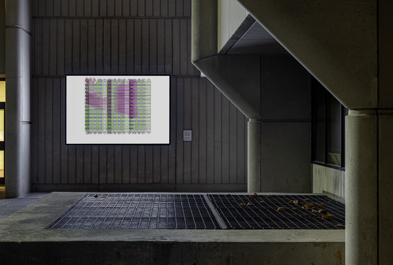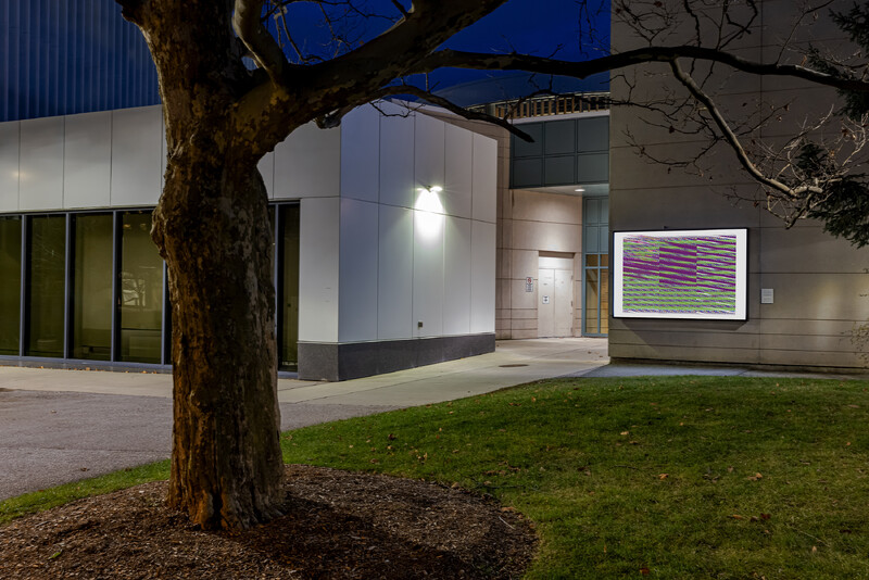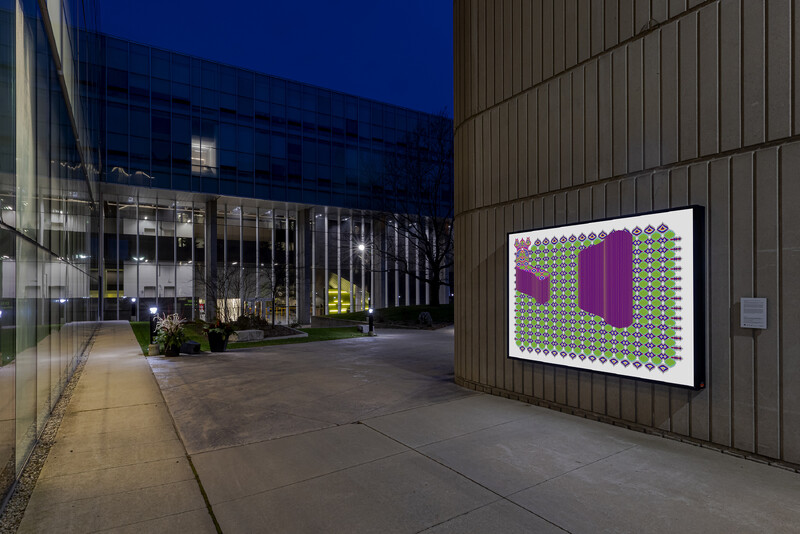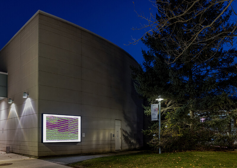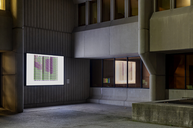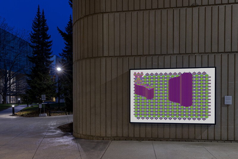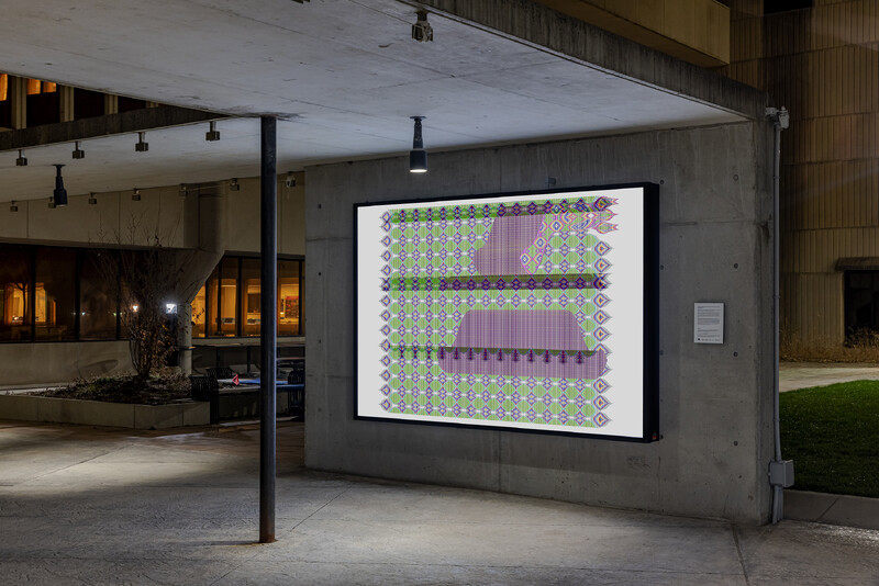 While Zazai’s work often engages with and mimics methodologies for creating Afghan carpets in digital form, he approached Is, but will be as an opportunity to respond to the parameters of Burning Glass, Reading Stone. Zazai used the numbers 4, 6, and 9 in this series (referencing four 6x9ft lightboxes at the University of Toronto Mississauga), in addition to an existing palette of numerical sequences referencing textiles used in carpet manufacture. Producing a series of four related images, Zazai plays with the repetition of color and symbol, and experiments with glitch imagery, attending to the lightbox’s status somewhere between a print and a computer screen.