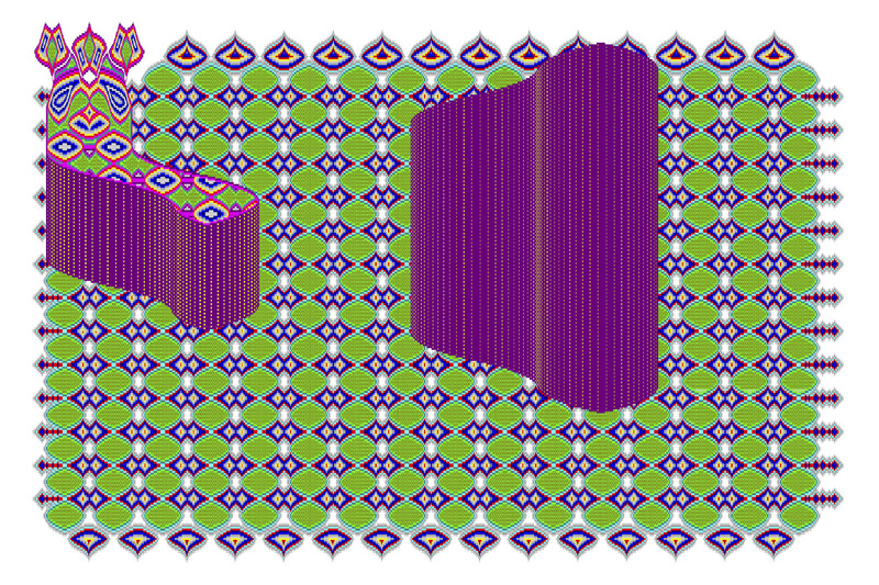 While this series differs from Zazai’s previous digital work in its absence of immediately recognizable carpet aesthetics, it puts an emphasis on other questions, calling forth histories of abstraction, coding, and visual representations of contemporary diasporic experience. What expectations to make cultural experience visible, perceptible, legible, and tangible to a broad audience do artists in diasporic communities navigate? What happens when traditional cultural imagery is abstracted to the point of data glitch? How can abstraction (as in Zazai’s images) question our understanding of diasporic imagery? Is, but will be—designed to convey a kind of information overload—offers us a look into a complex world of information, translation, and contemporary diasporic experience, lurching between colourful prayer carpets and code, rituals and numerals, personal identity and abstraction.