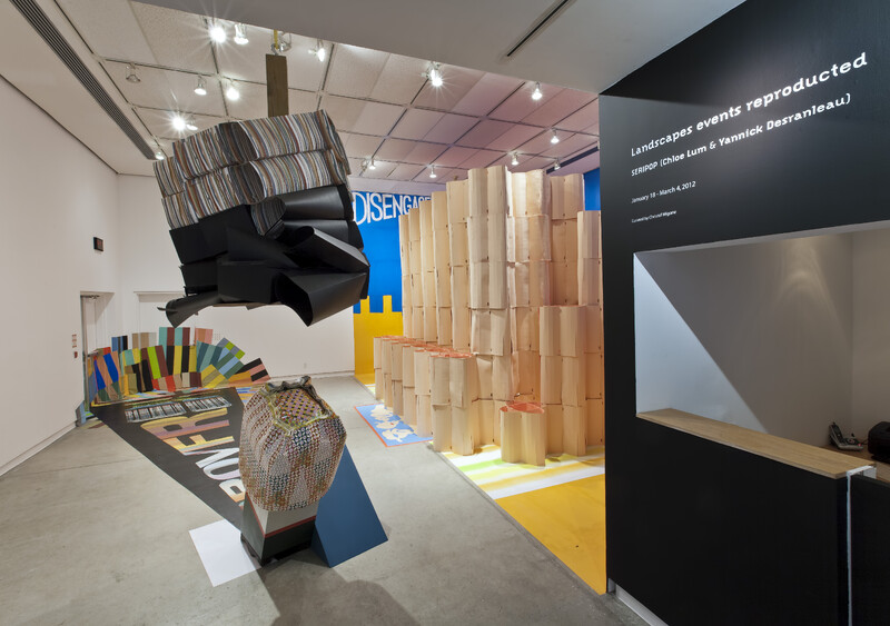 In Seripop's first major solo exhibition the duo of Yannick Desranleau and Chloe Lum shape posters into immersive ephemeral spaces; transform the galleries into ur-urban landscapes—Kurt Schwitters' Ursonate rendered into form, nod also to his Merzbau; layer proto-messages of agrammatical gibberish—the word reproducted doesn't exist, but is close enough to recognizable to cause confusion, this opens the door to the other instances of written glossolalia throughout the work; manifest a distaste for Le Corbusier's sterile modernism—Le Corbusier is both the villain and the reference; play with possibilities until monomania sets in—once the idea has been tested and tweaked, stick the repro machine on repeat and see what the abundance produces; cover the white cube and the black box with repetitive patterns of noise print—minimalism in the shape of maximalism; trace the viewers' erosive steps—put art on the floor and force the viewer to trample the commodity and thereby ruin it; sculpt with soft materials—the fragility of paper suggests a playful craft-based skill rather than one predicated on a mastery indexed by perennial Classicism; ink flows and fluxes—committing ink to paper is not as stable as the Law would profess, Seripop refuses to sign; structure an erratic conversation—dialogue, yes; conclusion, no; reconstruct constructivism with a punk ethos; reference the streets of a dystopian Montreal—post-Drapeau, post-Expo '67, post-Referenda, post-post; devise DIY architecture as a place where the local is everywhere—be simultaneously specific and general; compose palimpsestic texts to read time into space; poster in three dimensions; map askew—a cartographer's nightmare; savor pleonastic tendencies—verbose run rampant; mine the sinuous—ouroboros curves; pupullate forms; screen the cinematic into stilled installations; occupy every inch of space like space gluttons; concrete amorphous abstraction; relish in operose excess; whelm over and over—overoverwhelm; differentiate between background and foreground no longer—flat depth; fester the synaptic firings until they splatter the walls floors and ceilings—out of brain storm; disturb and derange 2d into 3d; synchronize symmetries while causing head tilts—using visual dissonance in order to break expectations; and inject structure with improvisatory tears and rips—plan to unplan. In short, the Blackwood Gallery is proud to present Landscapes events reproducted.