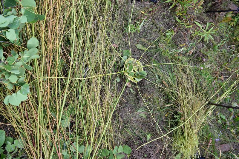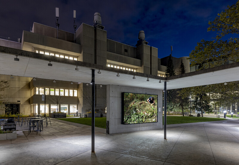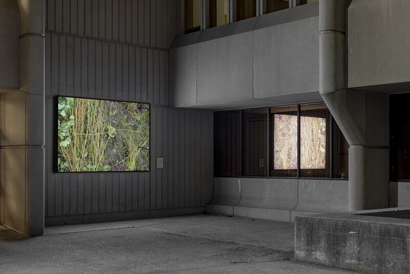 Asinnajaq and Camille Georgeson-Usher’s collaborative work, this world, here; nesting, shows the construction of a lifesize nest made of grasses, leaves and surrounding flora found in Northern Alberta. Sitting on top of an old railroad track, the nest is big enough for two people to sit comfortably in it, in a pathway beside a small lake that is well-travelled by locals as well as visiting artists for the land-based residency program common opulence that is hosted there. The nest is an invitation to sit listening deeply to the land, to connect profoundly and to witness the stories it has to share with us.
