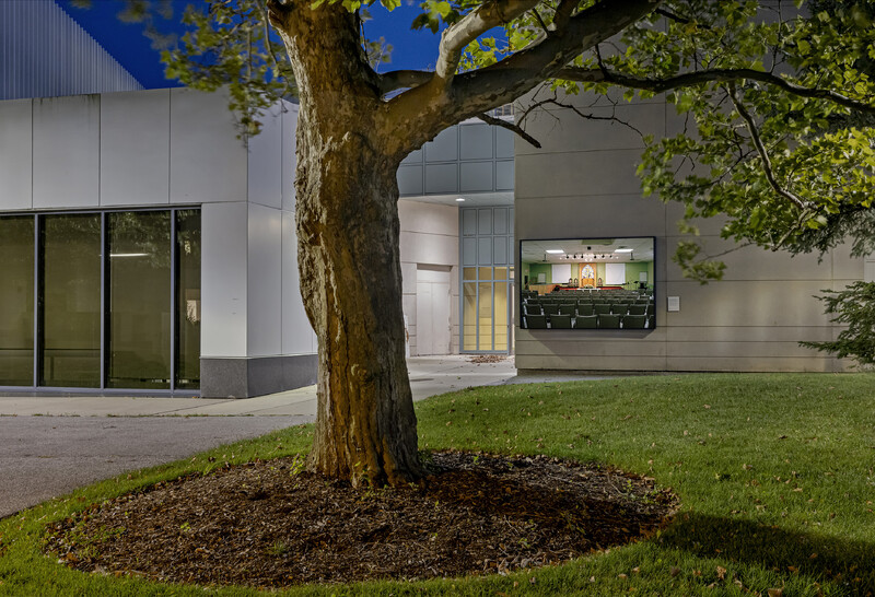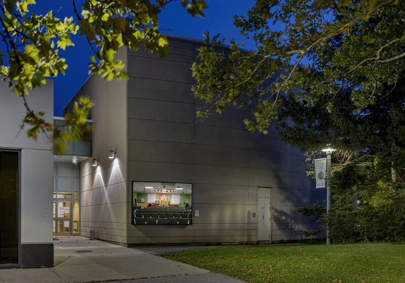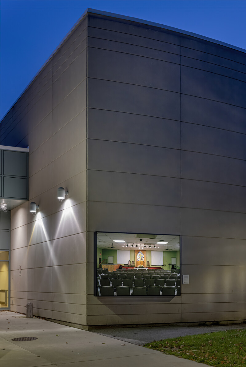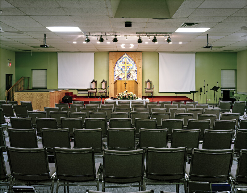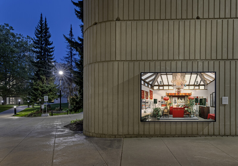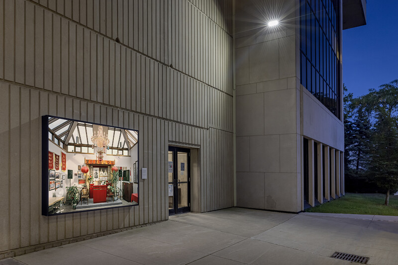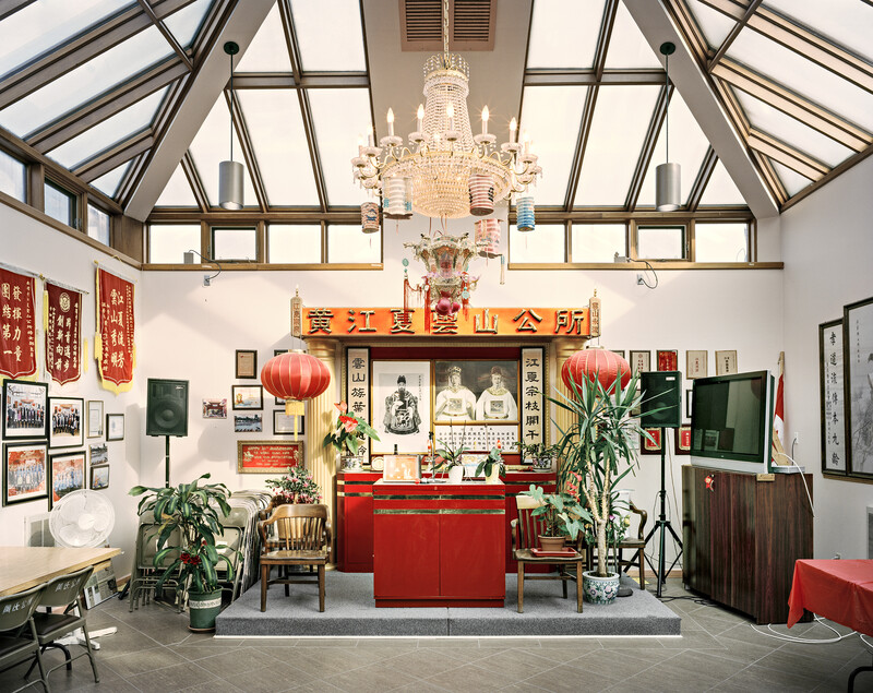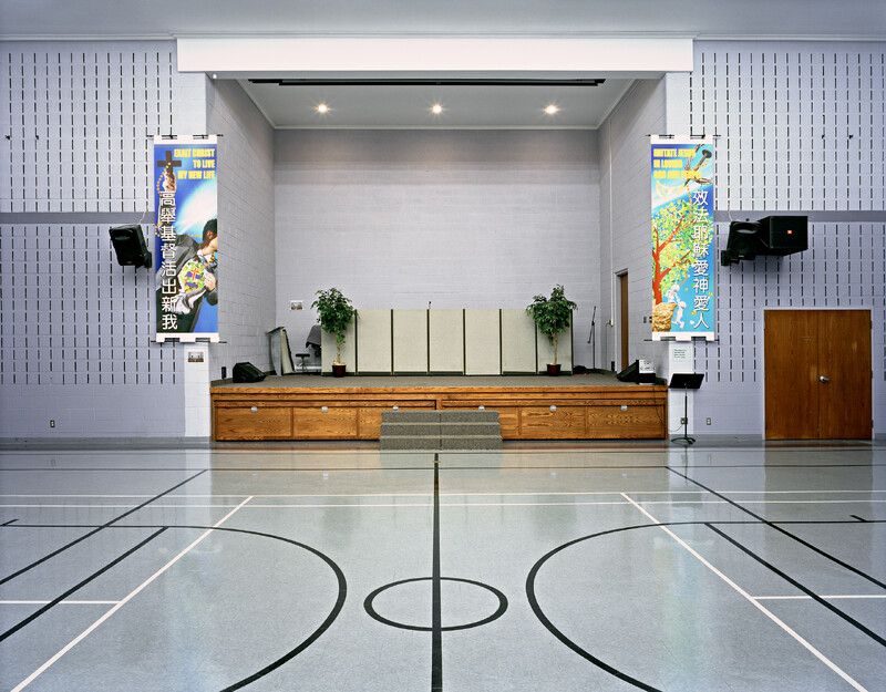 Images from Lum’s ongoing photographic series’ Tong Yan Gaai (唐人街) and Places of Worship (both of which document Chinese-Canadian histories of community-building in Ontario and beyond) show how spaces like churches, community centres and family associations hold multiple meanings—in their presence as well as their absence. They also reveal their multi-purpose nature: In the images, familiar architectural features like stage platforms, furniture such as stacked folding chairs, and objects like music stands and speakers point to the many ways in which they are used, such as for concerts, daycare, counselling, rehearsal and more—both inside and outside of the Chinese diaspora.