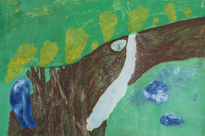 In a similar vein, Jumana Emil Abboud’s work, titled The Dig, invokes blessed and haunted water sites via Palestinian folklore. Activated by spirits, demons, angels, and jinn,3 the water sourced from these sites is believed to hold curative and transformative powers. Water from these sites is handled with prudence and care, with the wellbeing of nature entwined with human health and spiritual protection. By employing anthropological and ethnographic methodologies and calling on the memories of elders, Abboud maps out sacred wells, oases, streams, and springs cited in Palestinian folktales. After locating them and gathering detailed research notes, drawings, photographs, and maps, she develops imagistic collages, animating and preserving Palestinian tales and rituals and reclaiming the Indigenous history of the landscape.