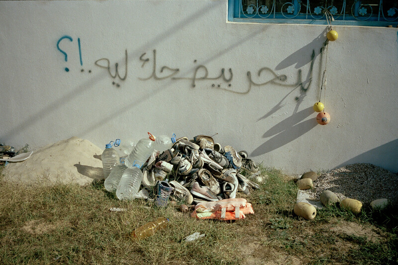 Taken in Momo’s garden during a joint visit with Rachidi, Sasha Davai’s photograph is a kind of trace or spectre, to borrow from Derrida, that “is both visible and invisible, both phenomenal and nonphenomenal.”2 The Arabic graffiti on the wall reads, “why is the sea laughing,” a reference to a poem by the Egyptian poet and critic, Naguib Surour. The presence of the migrants’ personal belongings set against Surour’s wistful verse serves as an eerie reminder of the lives lost at sea, while also speaking to the longue durée of colonialism in the Maghreb, which continues to haunt the present. Davai’s image further reminds us of the blessed/haunted binary as it relates to water: water as a means of purification and source of rebirth, and water as a sublime force of nature haunted by the ghosts of harragas.