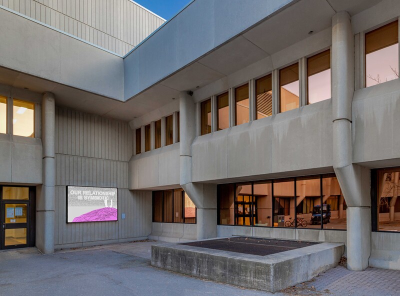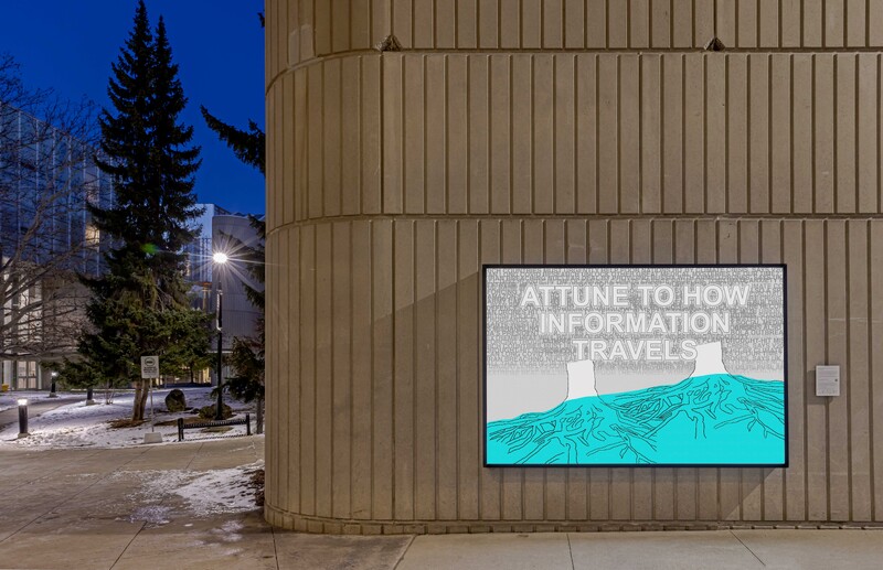Across the series, Battle offers prompts that seed the impulse to regain a sense of agency against fatalistic attitudes: “FOLLOW THE THREADS OF THE NETWORK,” “ATTUNE TO HOW INFORMATION TRAVELS,” “CONSIDER WHO YOU ARE IN RELATION WITH,” “OUR RELATIONSHIP IS SYMBIOTIC.” With each statement, Battle cuts through the noise of the news with strategies of empathy and criticality that foster collective resilience and action. The analogies between the natural and more-than-human world, urge viewers to recognize social and ecological relationships. These statements are not intended to be a utopian antidote, but rather achievable and persistent empowerments.