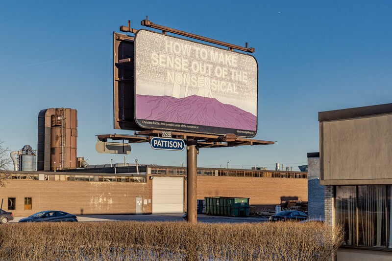 Each part of This Unfathomable Weight features a fifth image on a public billboard in Mississauga for the first month of the exhibition. For Movement Two: Ecology, the public billboard appears on Lakeshore Road East, east of the intersection with Lakefront Promenade, on the south side facing west, January 9–February 5, 2023.