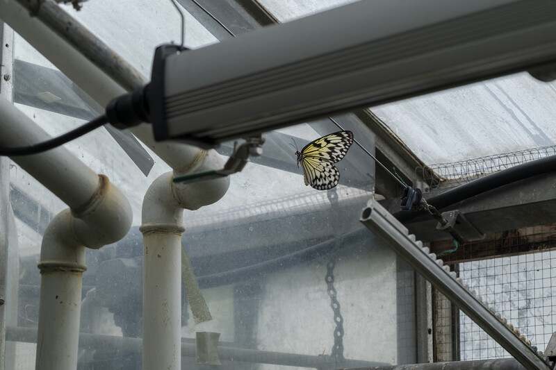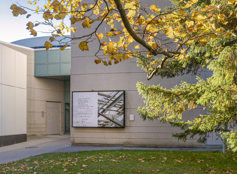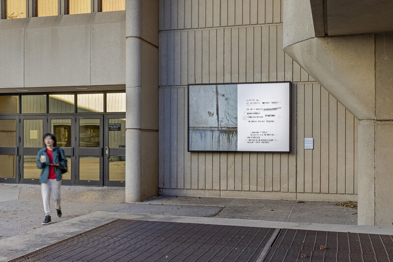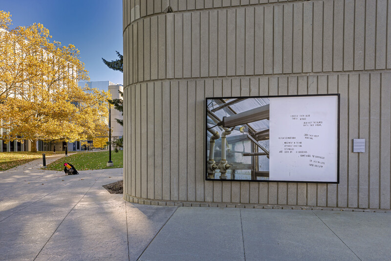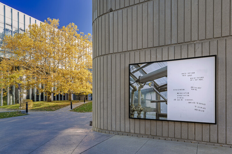 In the Blackwood lightboxes, Sandell has combined still photographs with text excerpts which appear in their short film of the same title. In the photographs, various butterfly species are seen against the backdrop of an industrial greenhouse, in a contrast that references the historic institutionalization of people with Autism. This effect is heightened by hand-stamped lettering, which alludes to systems of cataloguing and categorization. Across the four campus lightboxes, text excerpts reflect the links between normative thought, neurodiversity, and what butterflies can teach us.