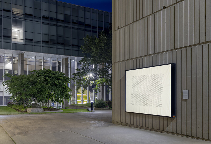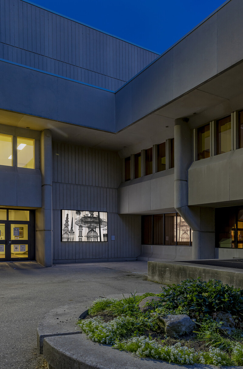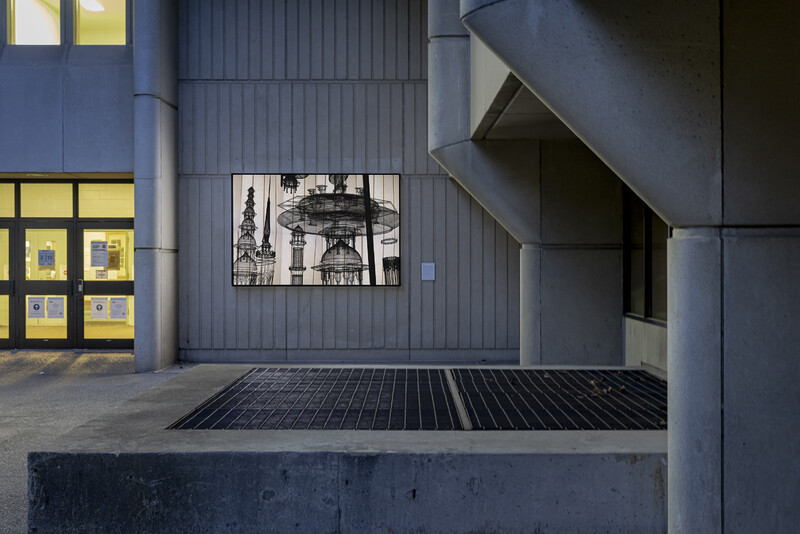 Centering the ornament in this series is to revitalize it as a field of artistic and cultural practice, while expanding its forms of communication. Each lightbox offers different ways of reading the ornament. They include geometric, architectural, painterly, and textual references that represent different artistic ways of ornamentation. Hamra Abbas’s Kaaba Picture as a Misprint depicts a geometric distortion of the most sacred site of Islam, a site of both pilgrimage and nostalgic return. Architectural forms in the work of Ayesha Singh attain more readability: iconic motifs of Mughal structures in India are recognizable despite their hybridized and amalgamated forms. Azadeh Elmizadeh’s work is situated between abstraction and representation in that it obscures figures in a battle scene, commonly depicted in the Shahnameh of Shah Tahmasp. The figures and their actions retain their relational energy in the heat of battle, even as they are effaced and made esoteric through painterly ornamentation. Finally, Golnar Adili’s Bestizand (They Quarrel) evokes binaries—of decoration and function, translation and opacity, textual and visual—that further explodes the ornament into the realm of possibility through articulation and refusal.