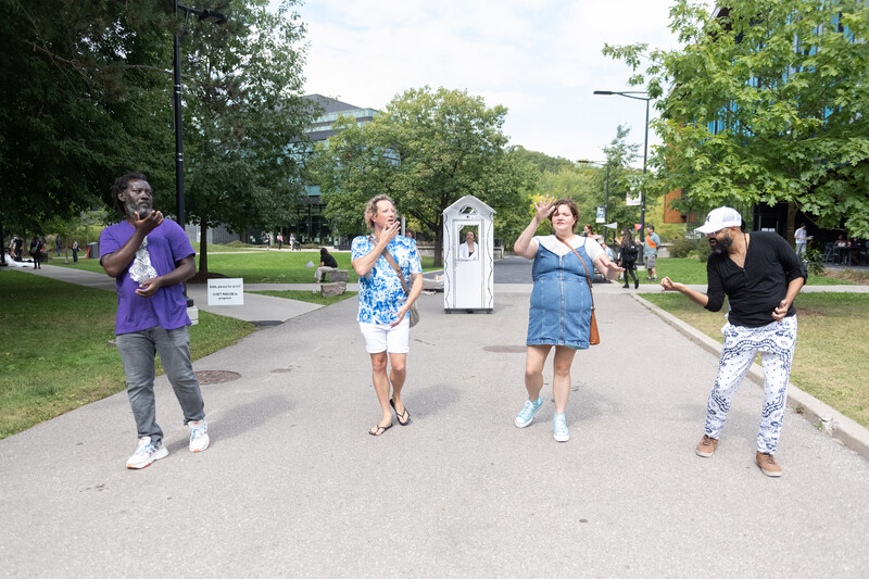 Themes of care, labour, and refuge are highlighted by Julian A M.P.’s oversized books symbolizing reference and escape, Lorena Torres Loaiza’s imaginary home reflecting a yearning for safe spaces for all, and Leena Raudvee leading a maintenance crew while using a walker, underscoring the adaptation and resilience needed to ensure accessibility. Her work draws attention to the invisible yet vital efforts that support community. QUIET PARADE opens up possibilities for collective access-creation and sharing space otherwise.