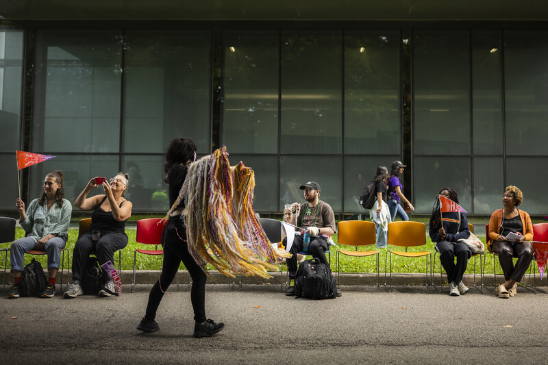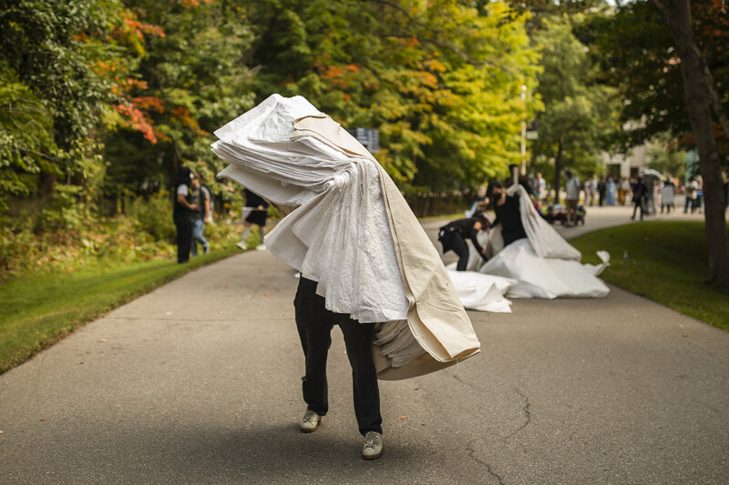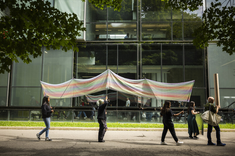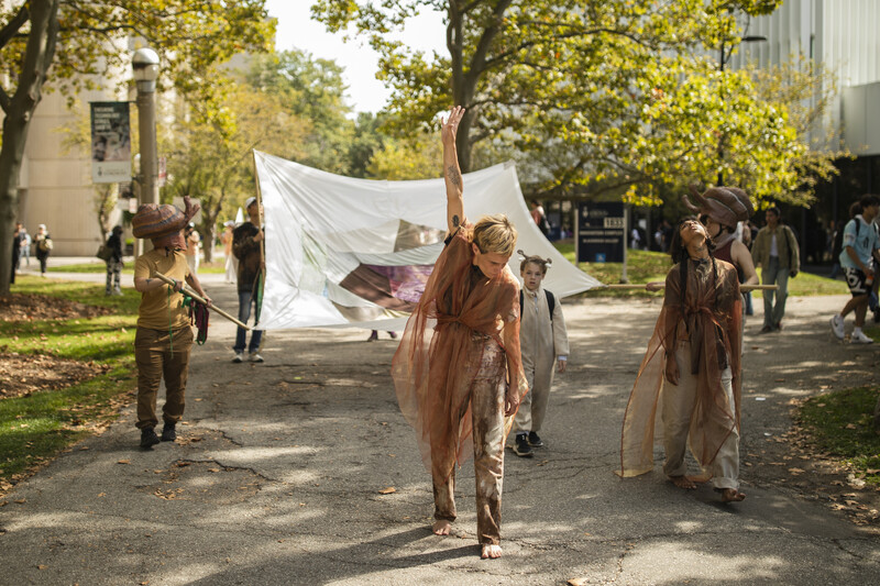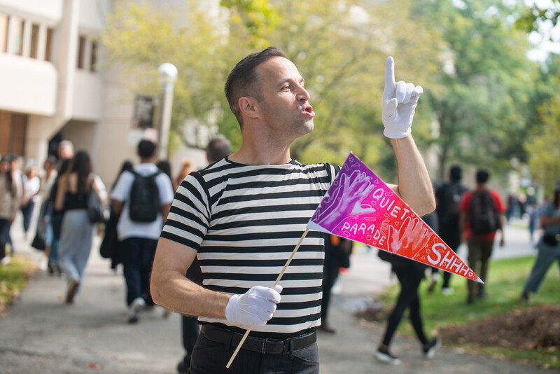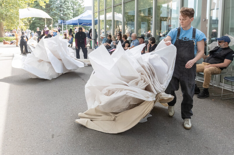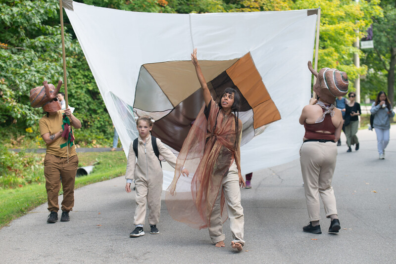 QUIET PARADE opens with signage carried by the UTM Office of Indigenous Initiatives. They are followed by Trevor Copp, a mime, setting the tone for quiet and mutual care. The FlagSSS Day Collective’s slow-moving flag corps guides the parade with gentle, snail-inspired movements.