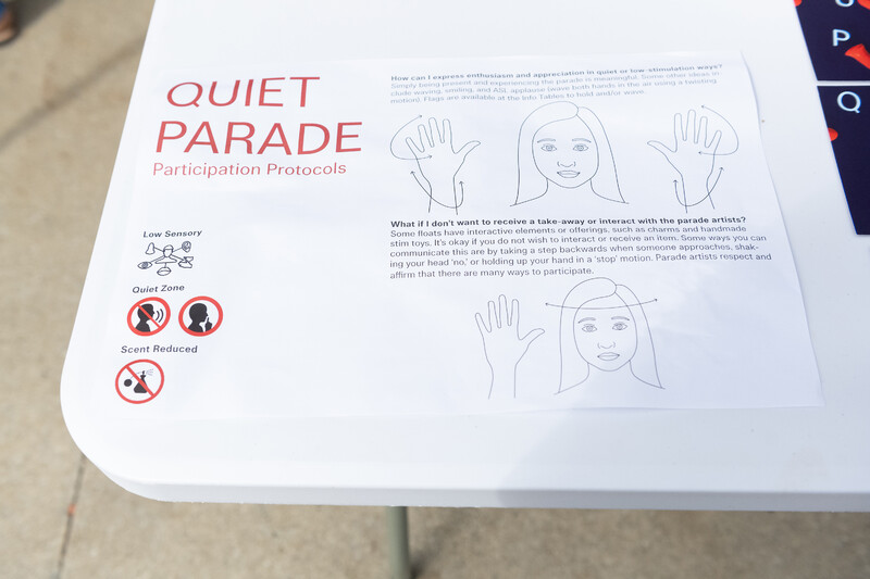 QUIET PARADE invites artists and the public to participate in creating a sensory-friendly, float-based ensemble that experiments with unconventional approaches to celebration and accessibility. Like a traditional parade, a series of discrete expressions come together to compose a multifaceted whole. One might encounter a marching band whispering songs of peace, joyful public stimming, heaping armfuls of soft sculpture worms, a dance between a broom and a walker, and more.