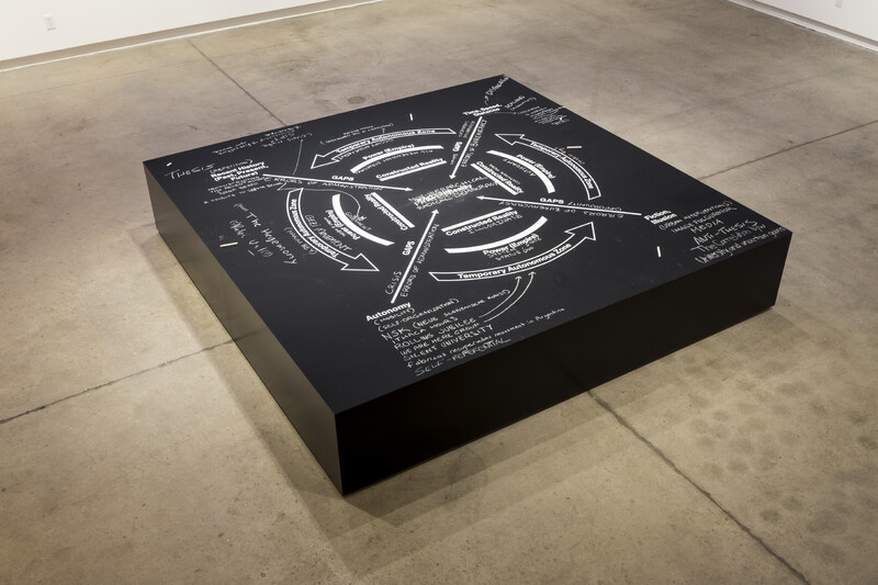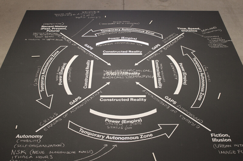 Strategies for Radical Democracy is the first solo exhibition of Turkish artist Ahmet Öğüt in Canada. The exhibition features seven key works dating from 2009 to the present, showcasing the range of Öğüt’s artistic practice across a variety of media including installation, intervention, video, and performance. The centerpiece of the exhibition is a raised platform structure (8’ x 8’) illustrating the artist’s theory titled Strategic Diagram for Non-hierarchical Participatory Radical Democracy. The diagrammatic structure functions as a way to analyze socio-political shifts and demarcate mediation. Öğüt identifies those that activate mediation, as “anyone who is trying or thinking about the possibilities of transforming the system.” This statement is the foundation through which the framework Öğüt has devised can be understood. The diagram is quadrant-divided and each forms a Constructed Reality built in service of a Power (Empire) that operates as a temporary autonomous zone and thus contains gaps as part of this shifting framework. The function of the framework is to provide a platform for non-hierarchical participatory radical democracy. Öğüt’s theories of Non-hierarchical Participatory Radical Democracy are delineated in his artistic practice as 1) Time, Speed, Distance; 2) Reconstructing Recent History; 3) Fiction/Illusion; and 4) Autonomy (Self-Organization). They are indicated in the four strategic zones of the diagram as well as in the physical structure positioned at the center of the gallery space. Viewers are invited to participate with their own theories by writing on the diagram with the chalk provided. The platform diagram provides a quasi-directional module for the exhibition by dividing the gallery into four corresponding zones, each wall indicating a zone, and each wall indicating works by Öğüt which reference its respective zone.