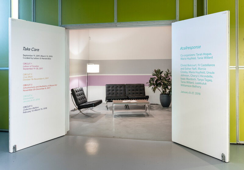 Take Care’s fourth circuit, Stewardship, decentres the isolated individual as the privileged recipient or the primary site of care. Against the calamitous futures wrought by extractivism and the state forces that enable it, this circuit explores stewardship as a potential counter-modality of caretaking. Relationality, shared responsibility, custodianship, interdependency, community governance, and intergenerationality: the contested lexicon of stewardship is difficult to avoid in efforts to respond to the crises of care cascading across multiple domains of life—ecological, social, cultural, political. Stewardship scales up care, and names the relational work of tending to a world, a resource, an artefact, a memory, a community, a knowledge system, an institution, a future. Stewardship forefronts ideas and practices of care that centre upon relationships to land, territory, and water, and that undo hierarchies between human and nonhuman. While irreducible to stewardship alone, this circuit’s exhibition—#callresponse—repositions the crisis of care within and against the intersecting forces of the nation state, colonialism, land dispossession, and patriarchy. As co-organizer Tarah Hogue writes in relation to #callresponse, “the resistance of Indigenous peoples exposes the precarity of settler sovereignty and opens possibilities for alternate conceptions of care and responsibility towards one another.”1