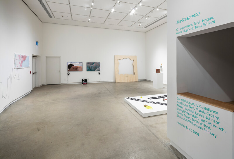 #callresponse is an artistic and curatorial collaboration co-organized by Tarah Hogue along with project artists Maria Hupfield and Tania Willard. The project begins with a series of five local art commissions by Indigenous women and artists whose home territories are located in the Canadian nation state. Each artist invites respondents to consider her work, and their responses are also included in the exhibition. The pairings include Christi Belcourt and Isaac Murdoch; Maria Hupfield and IV Castellanos and Esther Neff; Ursula Johnson and Cheryl L’Hirondelle; Tania Willard and Marcia Crosby; and Laakkuluk Williamson Bathory and Tanya Tagaq. Following the initial commissions, a touring exhibition opened at grunt gallery in Vancouver in 2016, with selected representations of each project continuing to evolve with each geographic location to which it travels.