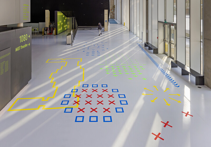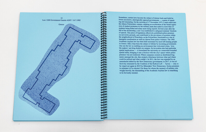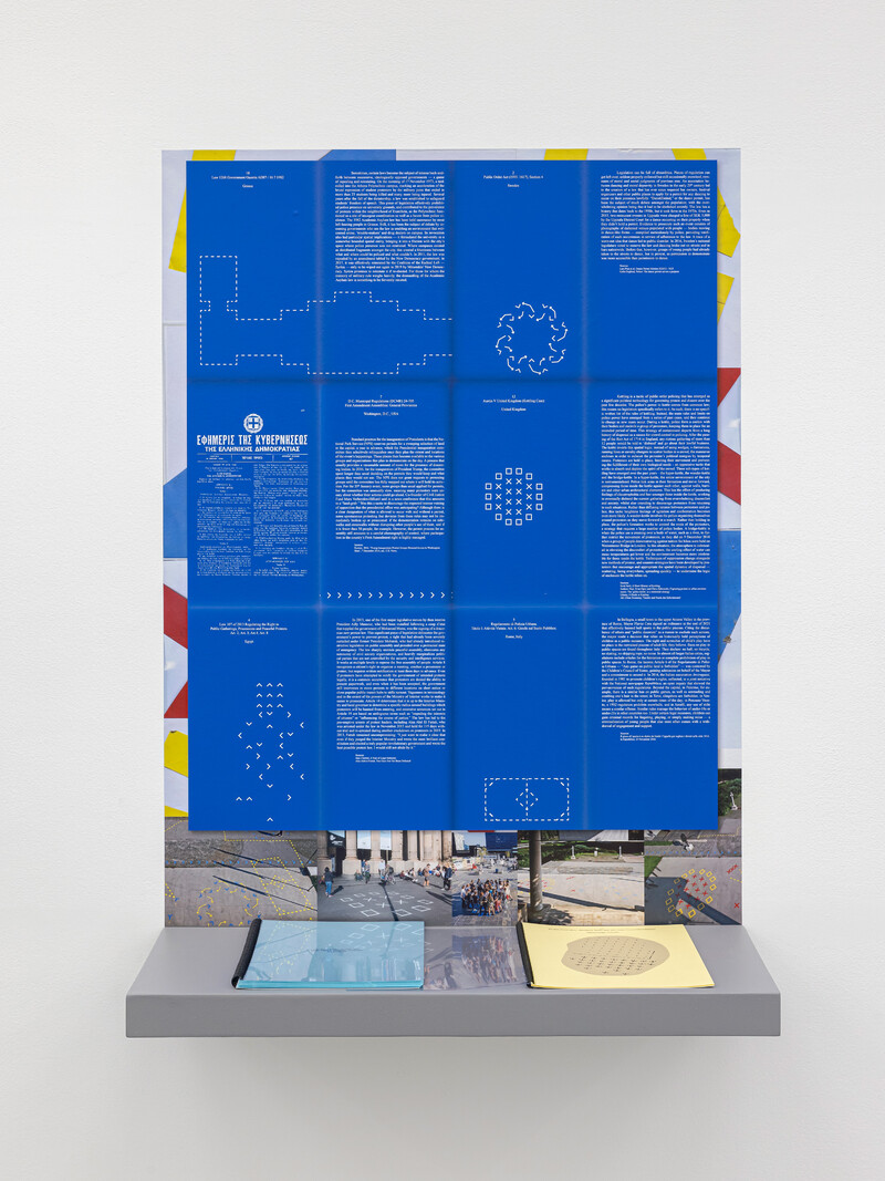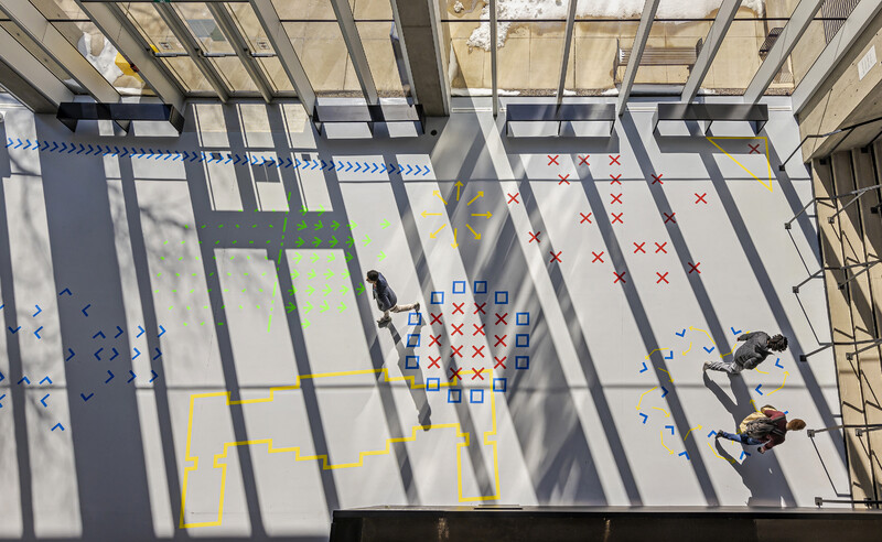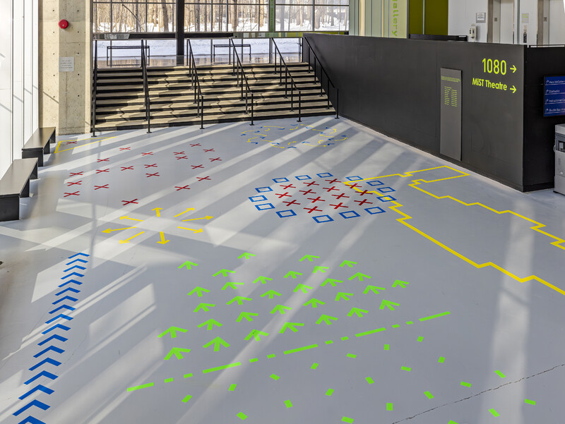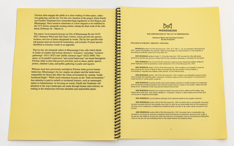 Paolo Patelli and Giuditta Vendrame’s Friction Atlas shares a similar critique of surveillance; they compile laws of public assembly, with a new entry in each exhibition locale. Past versions have chronicled policing of “anti-social” behaviour in Victoria, Australia; campus sanctuary protections in Athens; children’s curfews in Iceland; and restrictions on freedom of assembly in New York City. These lawsare illustrated using large-scale floor diagrams in public space. For this presentation, the artists have researched laws in Mississauga and Peel Region to add a new entry to the Atlas, which will be exhibited in the CCT atrium during the exhibition’s final week (February 26 – March 5), while existing materials from Friction Atlas are presented in the galleries throughout the exhibition.