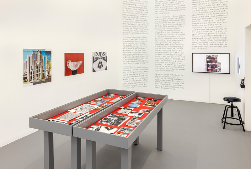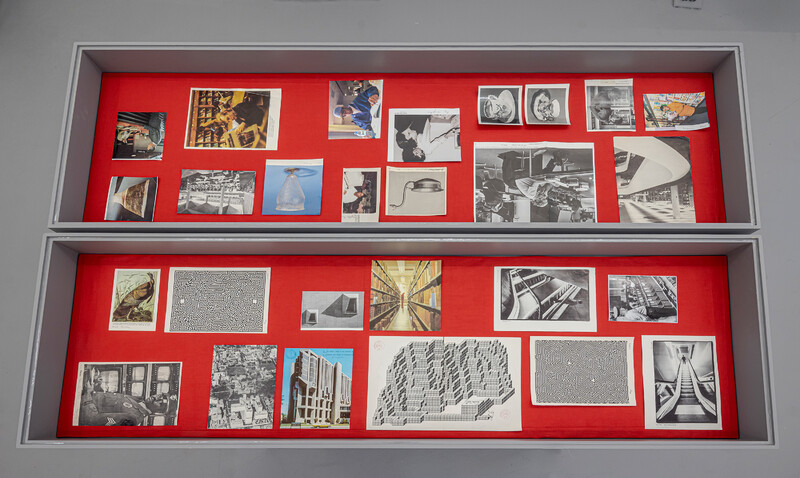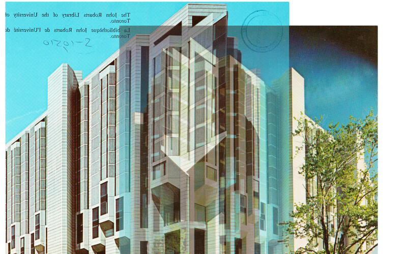Maïder Fortuné and Annie MacDonell’s The Bird and the Cup examines the effect of architecture on individual bodies. Contrasting two vastly different institutional buildings—the Toronto Reference Library and John P. Robarts Library at the University of Toronto—the artists speculate on feelings of harmony, alienation, or surveillance that buildings might engender. Fortuné and MacDonell’s installation draws on the Toronto Reference Library’s Picture Collection, an eclectic resource which serves as a visual taxonomy of popular imagery since its conception. With images of Robarts and the Reference Library both gleaned from the Collection, the two buildings anchor the artists’ practice of close looking, layering, and contrasting. In their hands, the Collection’s generalizing ambitions give way to difference and introspection.
