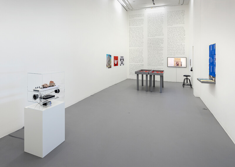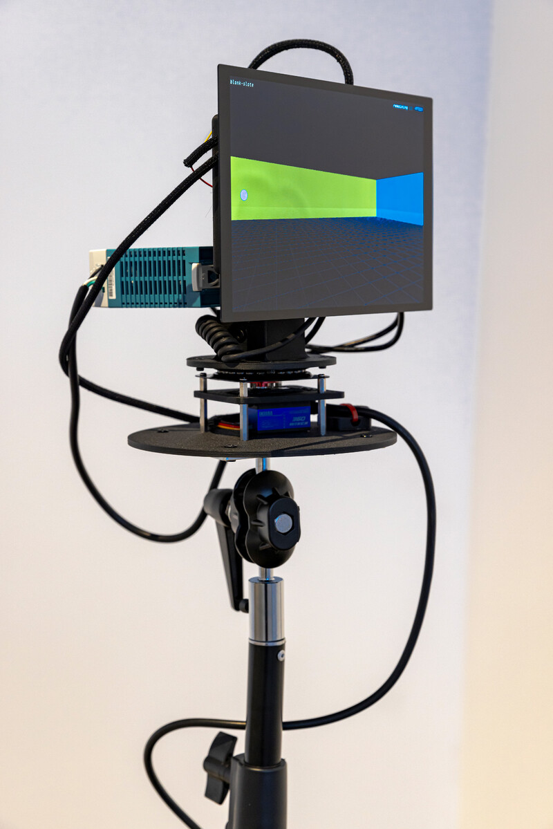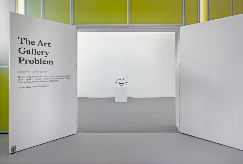 The exhibition begins with a new commission by Matt Nish-Lapidus, who simulates the art gallery problem using artist-written software and consumer tech. A series of human-scale sculptures serve as proxies for museum guards, outfitted with screens that mimic a surveillant gaze and depict mutating renderings of the gallery. Rather than replicating surveillance technologies, however, Nish-Lapidus inflects his work with hubris, informed by histories of computer-aided design and technological skepticism.