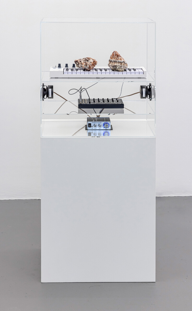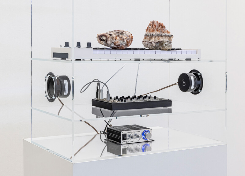 If artworks are traditionally singular objects offered for visual consumption, artists resist this convention by making works that are multisensory or ineffable. These qualities, such as air or vibration, can elude capture within a framework like the art gallery problem, which can only observe and measure discrete objects. In Nikita Gale’s GRAVITY SOLO III (HYPERPERFORMANCE), calcite stones “play” a keyboard with a droning note that discreetly changes over time. Gale’s work gathers irreconcilable actors in a durational performance: gravity, human finitude, and geologic time. Jeremy Toussaint-Baptiste’s Knockin’ Pictures Off the Wall (Kill Yr Idols) underscores the haptic properties of bass by configuring a car sound system to shake the wall on which it’s mounted. For Toussaint-Baptiste, bass is an ambivalent, inescapable aspect of urban experience that carries deep psychological and physical effects. Knockin’ Pictures Off the Wall emits rhythmic thudding, the result of a subwoofer in creative, iconoclastic misuse.