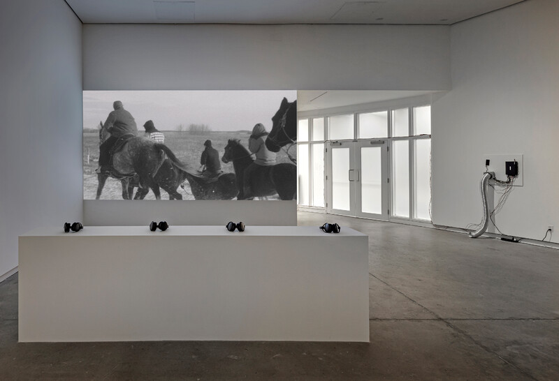 With similar attention to display practices, Karthik Pandian’s film மனசு (manasu) was catalyzed by the 2020 toppling of the Christopher Columbus statue in Minneapolis. The project emerged from activists’ critique of colonial monuments, which entrench dominant settler storytelling in public space. Rooted in long-term collaboration, Pandian’s expansive project “braids Indigenous prophecy, Black music, and mythological film to challenge the colonial monument’s claim on space and time.”33Description courtesy the artist. In மனசு (manasu), relationship-building, inter-cultural solidarity, and performance serve to resist to the permanence and pomp of civic monuments.