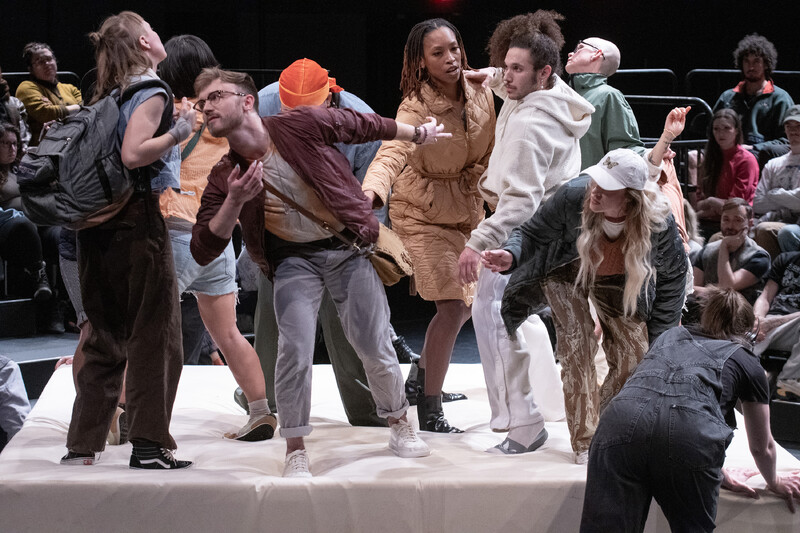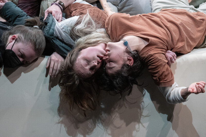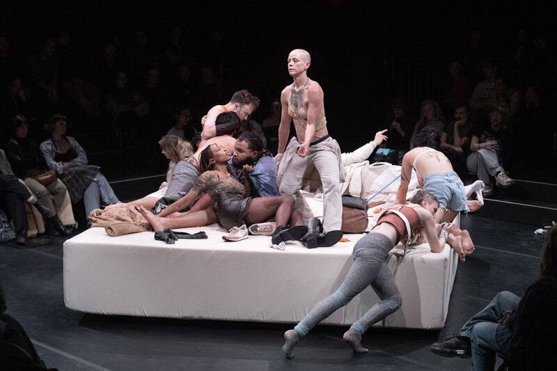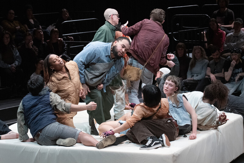Weathering is a multi-sensory performance, conceived by Driscoll as a moving human sculpture made of bodies, sounds, scents, liquids, and objects. Ten performers perpetually enact a morphing “tableau vivant” on a mobile raft-like stage. Their life raft surges and spins through crisis and alienation, with their voices generating a score that crescendos and resonates as they clutch, careen, and cleave on a platform too small to contain them. The audience embanks the performers, close enough to smell the sweat and feel the steam of the scenes unfolding before them. Weathering enacts conflict, eroticism, and care arising from a messy and mutable collectivity.