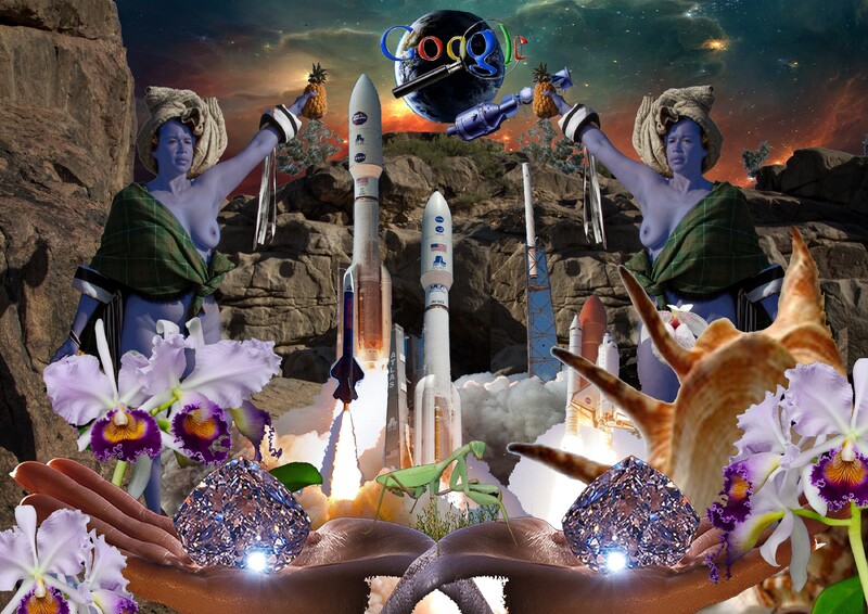 This digital collage weaves phallic and yonic imagery, combining natural forms with technological elements. The symbolic representations of wealth and opulence, embodied by the pineapple, orchids, and diamonds, suggest a narrative of prosperity and luxury. Whittle's chosen pose adds an additional layer of meaning, hinting at the convergence of liberty and decadence through the advancements in science and technology. Viewed through an Afrofuturist lens, the artwork posits that true freedom might be discovered among the stars, offering an escape from the persistent inequalities on Earth.