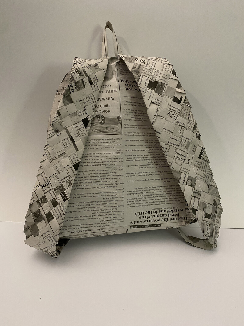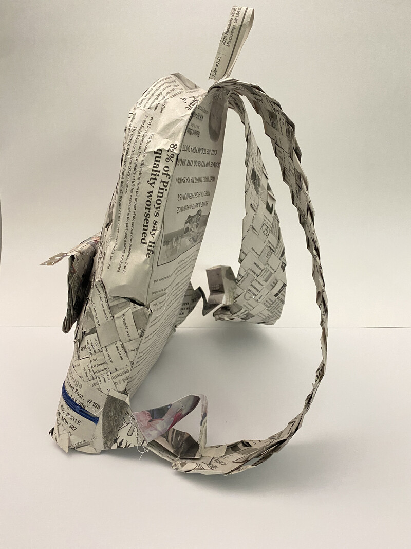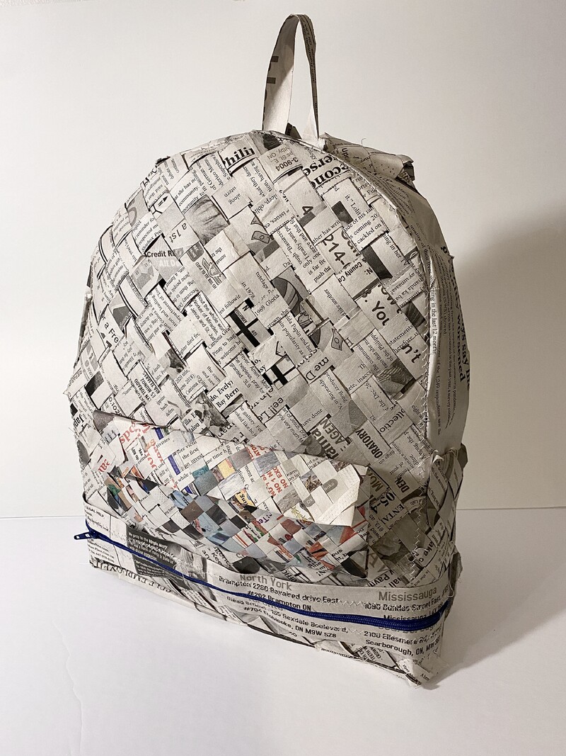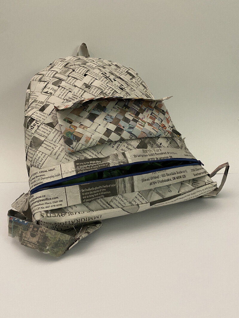 Growing up in a Middle Eastern country as a Filipino, the idea of home has always been complicated for Nikki Natnat. Carried explores the notion of home as transient and informed by multiple places all at once. Drawing heavily from the artist’s nomadic childhood and adolescent life, Carried is a wearable artwork in the form of a backpack constructed using a traditional Filipino hand-weaving technique with balita or newspaper. The zipper of the backpack is placed on the lower portion of the bag’s front as a dedication to Natnat’s mother, its placement representing the incision of the artist’s C-section birth. The artwork is fully activated when worn by the artist as it is only then that the artwork is truly at home. Now a Canadian citizen, Natnat continues to carry her identity everywhere she goes. Through her work, she aims to honour the knowledge that has been passed down from her parents and others before her.