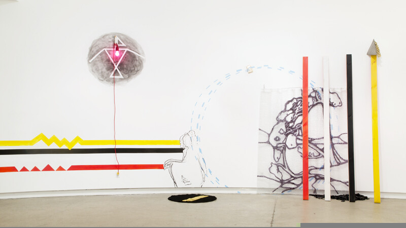 East Wind Brings a New Day: Revisited (2015), a supergraphic wallwork and installation by Brooklyn-based artist Maria Hupfield, juxtaposes images of the Ontario landscape with sculptural elements that reflect Anishinaabe culture. The central element in the installation is a shower curtain upon which Hupfield has cheekily painted a version of ‘Group of Seven’ progenitor Tom Thomson’s iconic early 20th-century West Wind in the ‘Indian Group of Seven’ member Norval Morrisseau’s equally iconic 1970s Woodlands style. Thomson’s curvilinear Art Nouveau stylization melds seamlessly with Morrisseau’s biomorphism. Seeing a version of the Georgian Bay’s storm-battered West Wind pines transplanted into a setting of domestic décor (and personal hygiene) is bracing, and humourously mirrored by the smudged drawing of a Thunderbird on the wall above from which a lit pink light bulb hangs on a red electrical cord. Further along, four pine two-by-four studs lean against the wall; the back of studs are painted fluorescent pink which reflects onto the wall; each individual stud is painted in one or the colours of the four directions—red, yellow, black, white—echoing the perpendicular supergraphic rendering of water and sky on the adjacent wall.