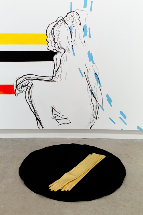 Hupfield includes a number of objects in her installation that she has used in her performances that combine references to Anishinaabe practices and storytelling, the history of performance art and contemporary culture. Perched atop one of the pine boards is a felt pyramid decorated with gold metal jingles, noisemakers traditionally made by Ojibwa women from rolled chewing tobacco lids that are sewn onto dresses used in a healing dance. On the floor is a black felt circle, the implied site of a performance, upon which sits a pair of gold lamé evening gloves; above, taped to the wall is a gold Mylar survival blanket. Drawings of the artist’s crouching silhouette appear on the wall at floor level, and indicate her presence while she worked on the installation. Had we been present to see the performance the artist left of the remnants of, we would surely have witnessed Hupfield hybridizing, internalizing, colouring and eventually bringing the First Nations and European grand narratives of the natural world indoors.
