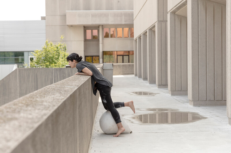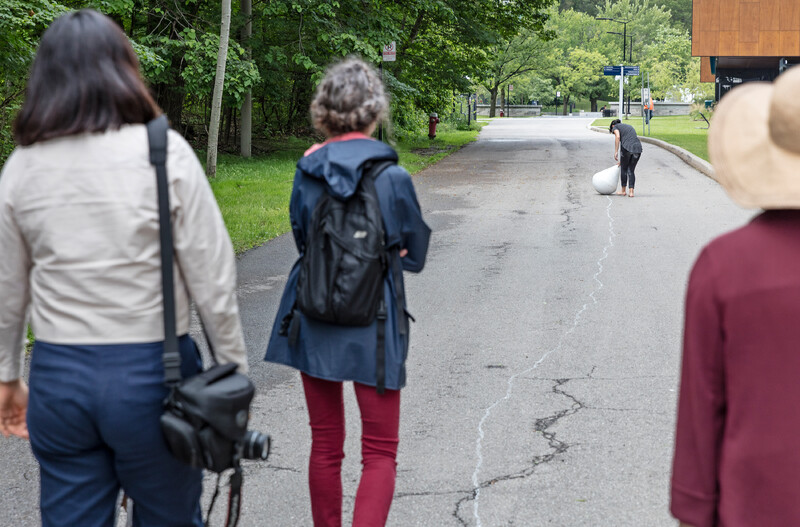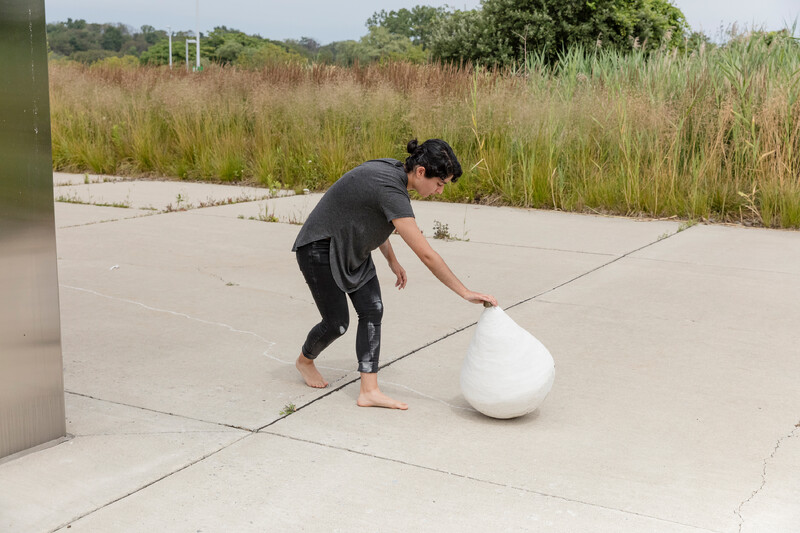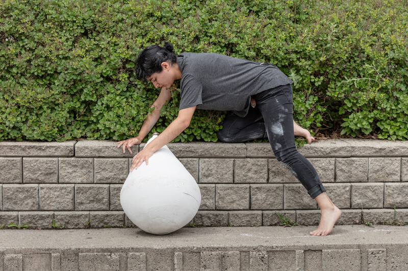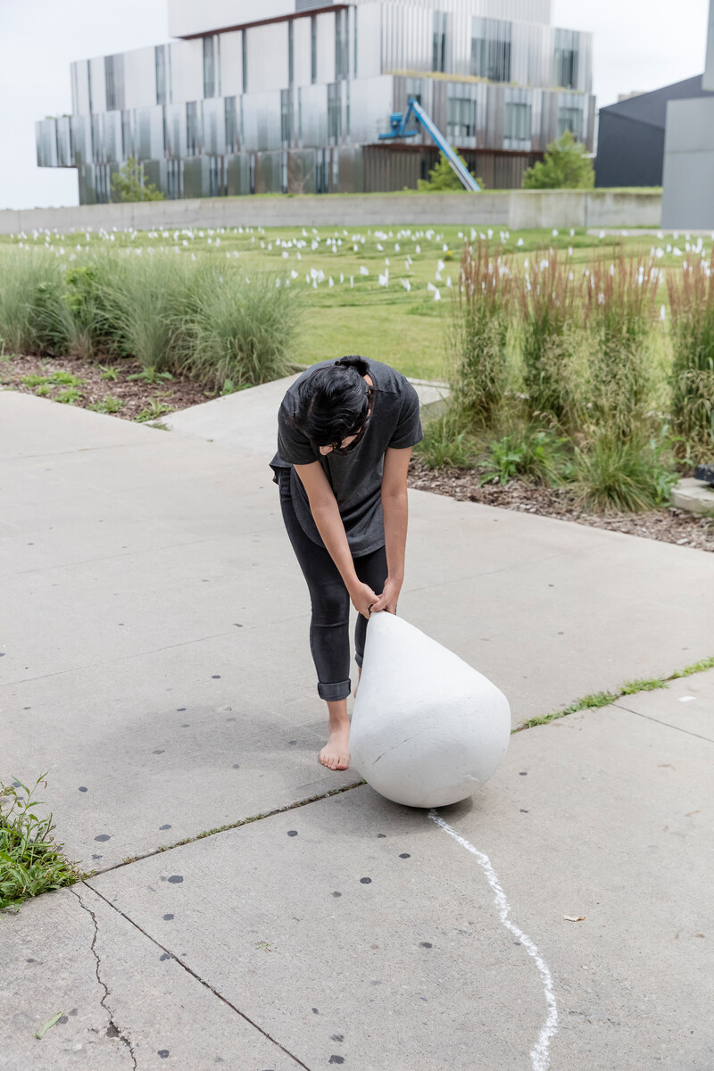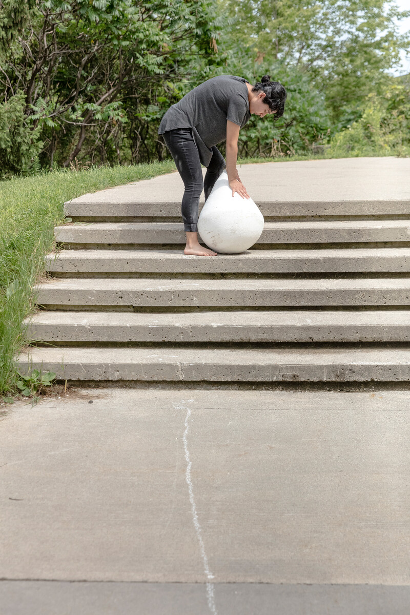 Abedar Kamgari’s site-specific performance, as part of her ongoing project Finding words for the feeling, navigates the unfamiliar spaces of the campus by tracing the intimacies of human presence woven into the University’s public but often inaccessible sites. In doing so, she explores the nuances of diasporic identity and of her relationship to Canada, both as a settler and as an immigrant. Throughout the performance, Kamgari hauls and heaves a large droplet-shaped plaster mass leaving behind a chalky trail to mark its presence on the land. The plaster mass is equally impacted with scuffs, marks, and dents from the landscape, gradually altering its appearance throughout the excursion. One can feel the excessive hardship involved in the mundane, even unnecessary, act of pushing and dragging a large object, as though to mirror the complexity of being a settler/immigrant in unfamiliar space. Kamgari’s labour-intensive and circuitous trek metaphorically captures the challenge of navigating space as an immigrant—in this case, the space of the university as it relates to the violent history and legacy of settler colonialism in Canada—and exploring the difficulties of belonging. In doing so, she addresses the dualities and contradictions located within immigrant and diaspora identities: to be both western and non-western, foreign and domestic, familiar and unfamiliar, here and there, and so forth. The site-responsive nature and duration of the piece further taps underlines tensions in the nature of performance and identity— does the performance end with the work itself, or does it extend to a conscious, daily assertion of self against the anxiety of placelessness and Otherness?