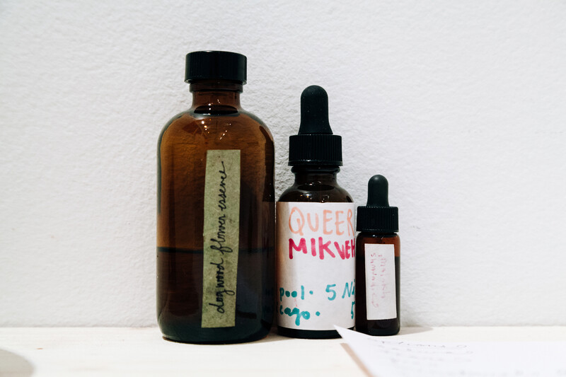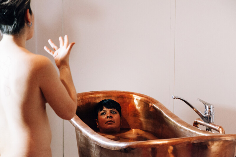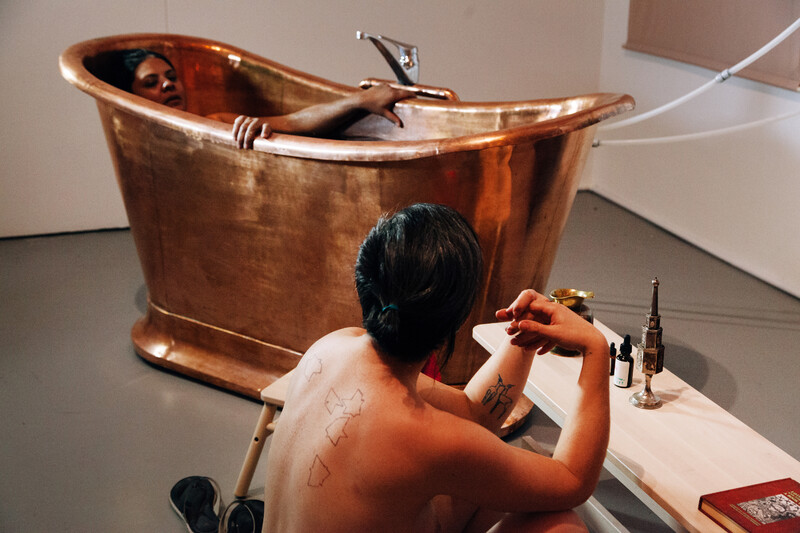 During each immersion, Radiodress and MKV participants connect with the waters of the nearby Credit River, outline their goals for the ceremony, and select the materials with which they wish to immerse themselves (with possibilities including saliva, tears, pee, menstrual blood, sweat, ejaculate, injectable hormones, medications, salt, rain water, snow, or other bodily fluids of their choice). Ultimately, each participant takes a private bath, in the gallery space, while Radiodress offers specific words to guide their attention towards healing and transition. Together, they decide how Radiodress’s presence as a guide will be manifest—either in person, in the gallery, or remotely, through radio communication. During the ceremony, participants reflect upon a personal change (including working through gender transitions, dealing with questions of fertility, or coping with the struggles of aging, illness, and death).