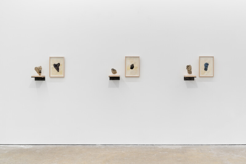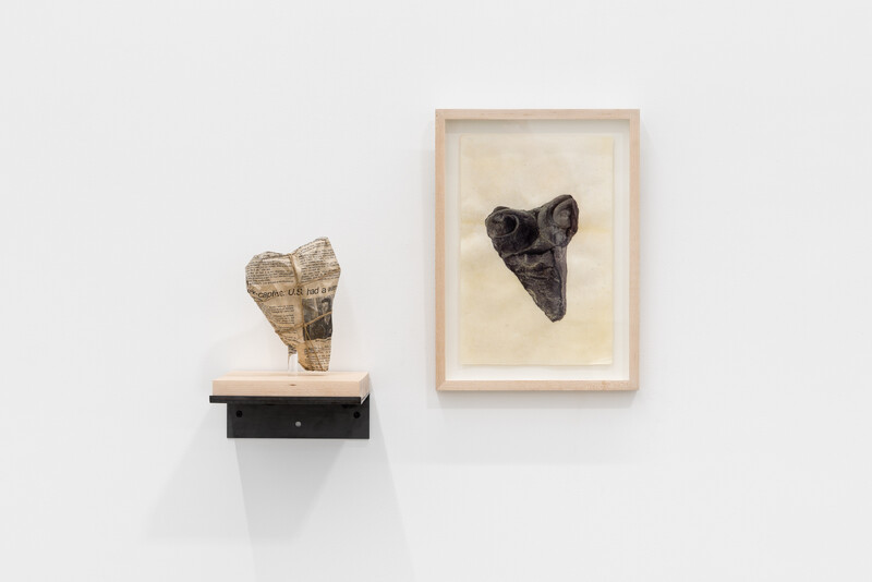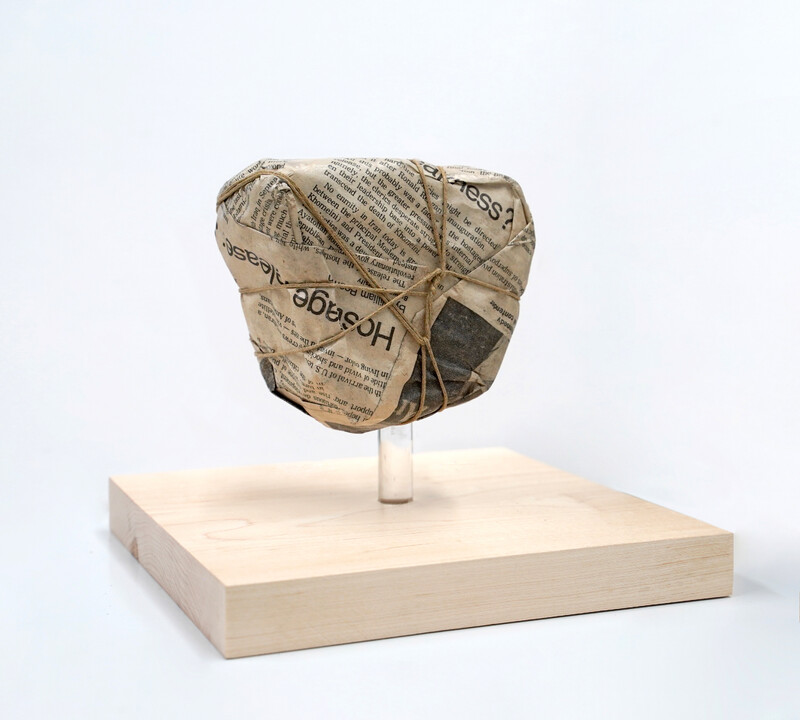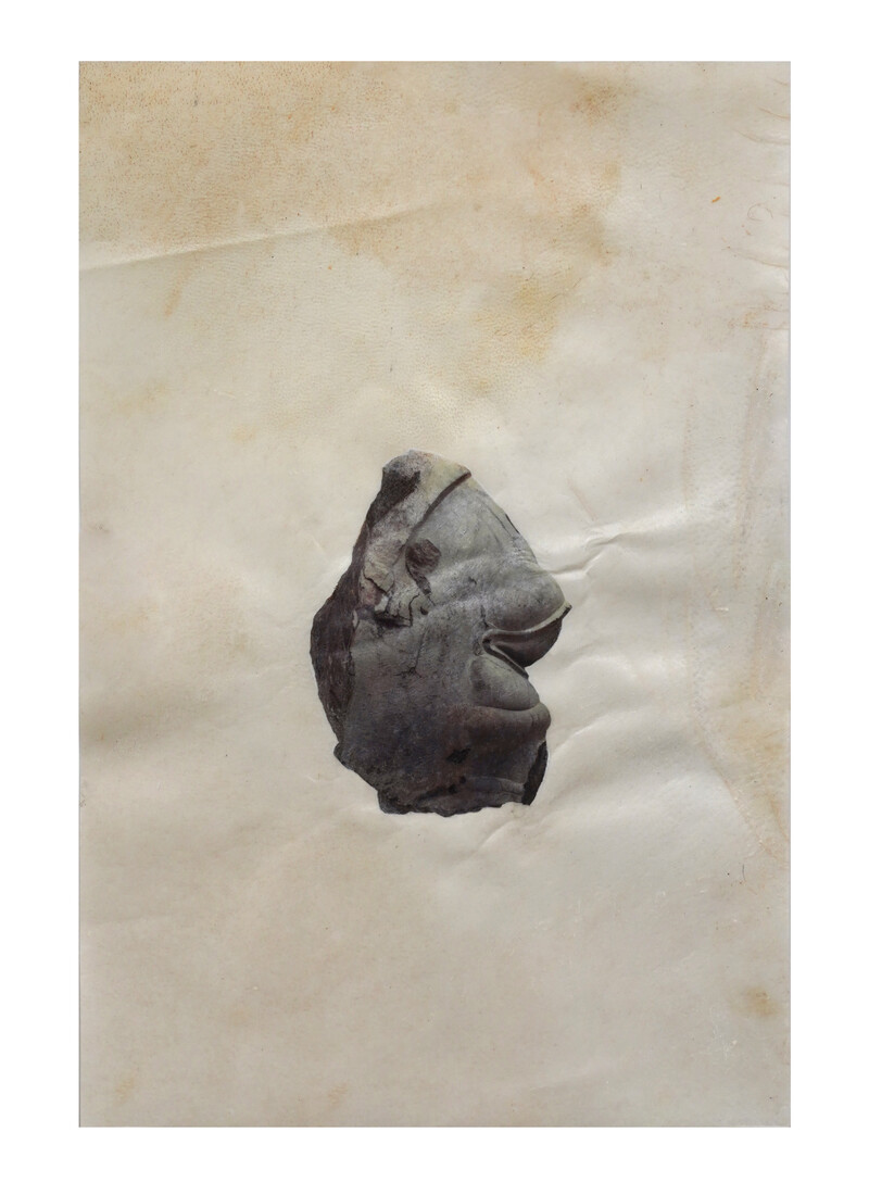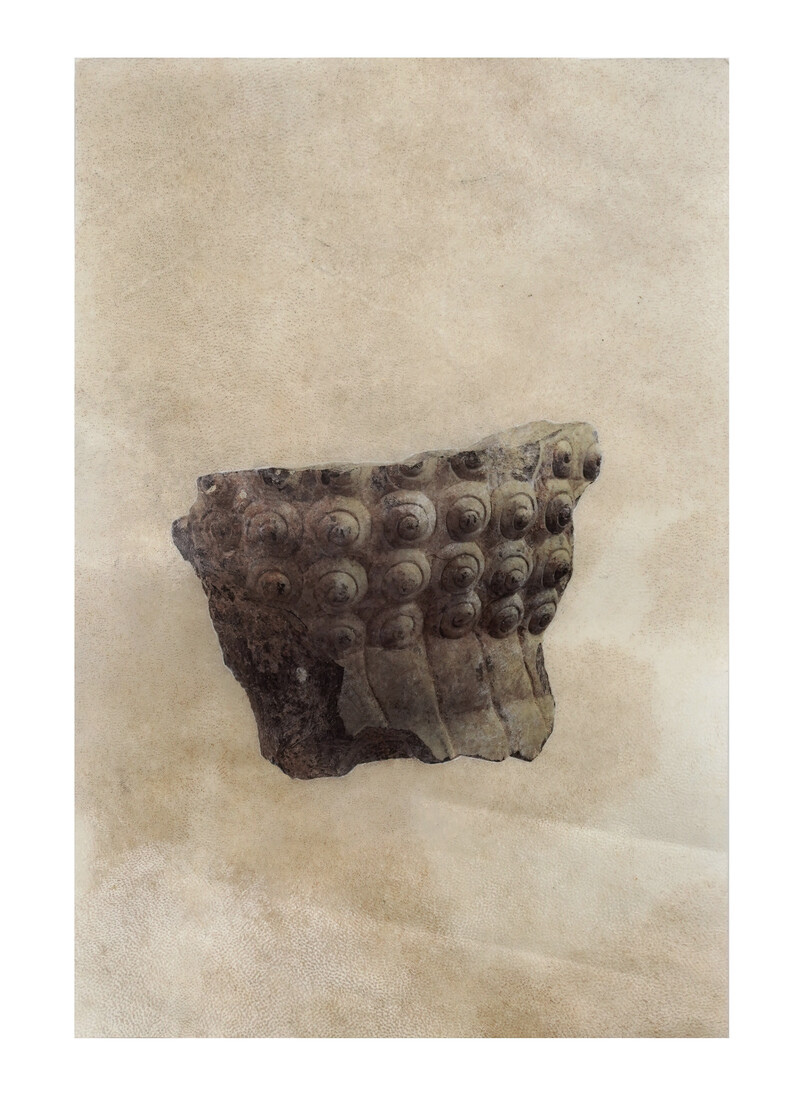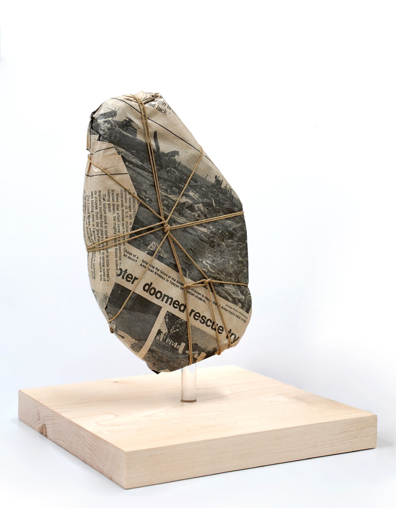 Made from limestone, the series replicates remnants of excavations from the ruins of Persepolis, held at the Institute. Accompanied by its corresponding image, retrieved from the catalogue records, each object is wrapped in newspaper, mimicking the hasty handling of looted artifacts. The cropped-out transferred images of these fragments on parchment evoke the disappeared undertext and mnemonic traits of the archival and the archaic—the goat skin is used as a material reference to the use of palimpsest as an ancient method of re-inscription. The detachment of distanced objects from their context in the collection is paired with recurring newspaper headlines, chronicling the plight of 52 Americans held hostage by Iranian students at the US Embassy in Tehran between 1979 and 1981.