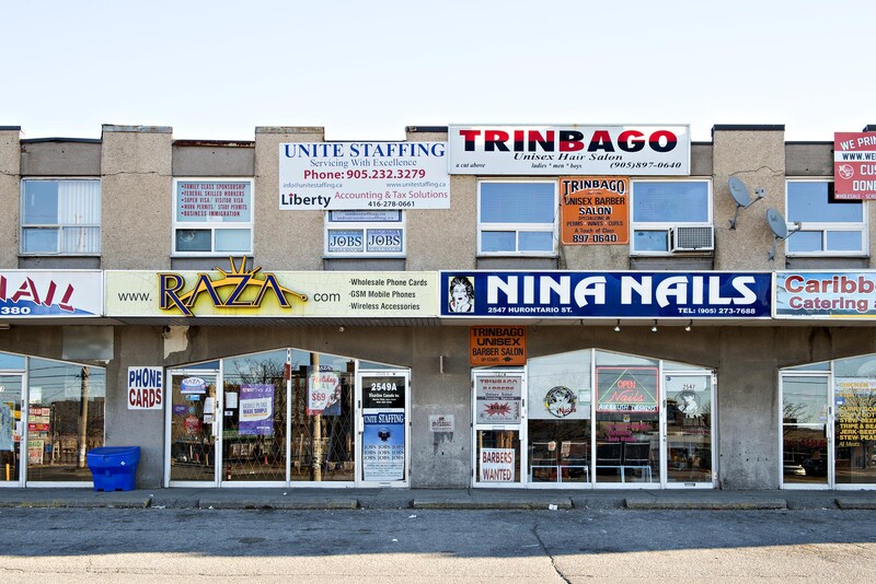 Sites of global money transfer services are indicated by the flags seen on the left. While flags are at home amid the bright colours of commercial signage, they also indicate the international scope of familial connections in Cooksville. Money links homelands here and abroad; it moves transnationally, changing shape along the way through currency exchange.