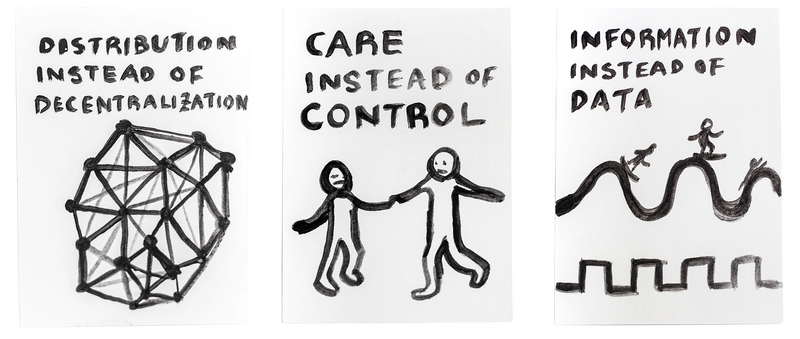 There is now a moment and opportunity to develop a different kind of internet, an internet which is more just, diverse and caring. The distributed web presents an alternative to the centralization of the big five tech companies. Similar initiatives are often referred to as the decentralized web. Although they have significant semantic and technical differences, I will group them as a family of likeminded projects for this essay. Harnessing new protocols like Dat, IPFS, SSB and various blockchain experiments, the distributed web presents a peer-to-peer model, prioritizing collective agency and individual ownership of data and code. Much like its infrastructure of autonomous nodes, the development of the distributed web is a collaborative effort, based on the community’s genuine excitement about the do-it-yourself, grassroots approach to rebuilding the web.