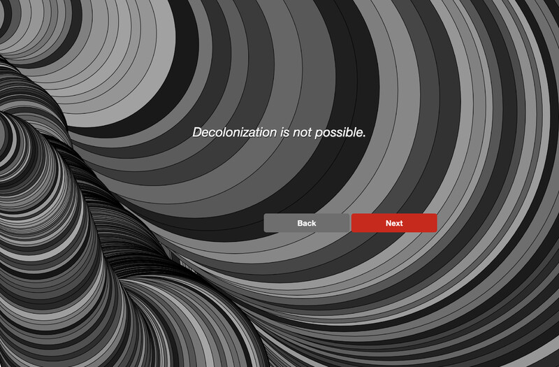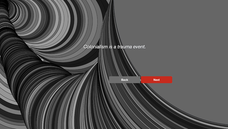Because decolonization is not possible due to the implication that it requires the settler to give land back to Indigenous peoples, I am instead interested in active forms of acknowledgment that lean into the more embodied or experiential—or, toward gestures of decolonization. As my work engages with the impossibility of decolonization, I ask participants to encounter the embodied gesture by actively acknowledging the damage of data colonialism. What then becomes necessary from all visitors to the work, regardless of their background, is the recognition of the ongoing violences and injustices against Indigenous peoples that drive the continuation of settler colonialism. In its move from gallery exhibition to digital space, this project enacts and experiments with different modes of encounter with data colonialism, asking: