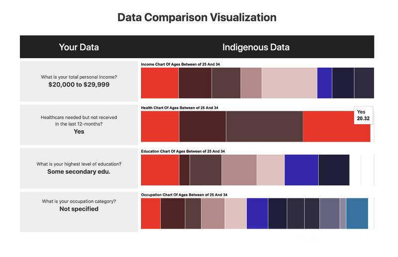 They are. We are. I am. prompts the visitor to offer their own data points, which are later compared to data points pulled from the Aboriginal People Survey (APS) for First Nations people living off-reserve, Métis, and Inuit living in Canada. The team and I chose to request data in the following areas: age, education level, occupation, and health access. These categories of data display the most disparate inconsistencies between the visitor and the extracted APS data. It is important to note that the visitor here is used to describe the average patron of contemporary art. However, we acknowledge that there would be folks of different ages and backgrounds and wanted to provide an experience with the most variety of output. With that said, for Indigenous peoples exploring the data visualization, it was geared toward solidarity and resource sharing. It is important not to collapse the different identities of patrons visiting the work. We wanted to display dissonance within the data. The most obvious data point to exhibit disproportion was health care, followed by total personal income, and level of degree achieved.