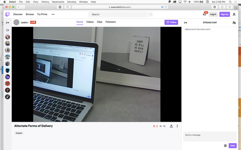 The last of these exhibitions comes as the COVID-19 pandemic has our master’s degrees in fine arts and design coming to a strange end. With the announcement of the university’s closure, we were given three days’ notice to document or remove what we needed, with communications from the administration repeatedly referring to “alternate forms of delivery.” In this context we installed Alternate Forms of Delivery, an improvised closed-gallery exhibition consisting of a livestream emanating from room 418. Hosted at twitch.tv/aaabcr, it shows a photograph of a sign reading “SORRY WE WILL BE BACK SHORTLY” and a computer viewing the same streaming video, which intermittently displays an error message.